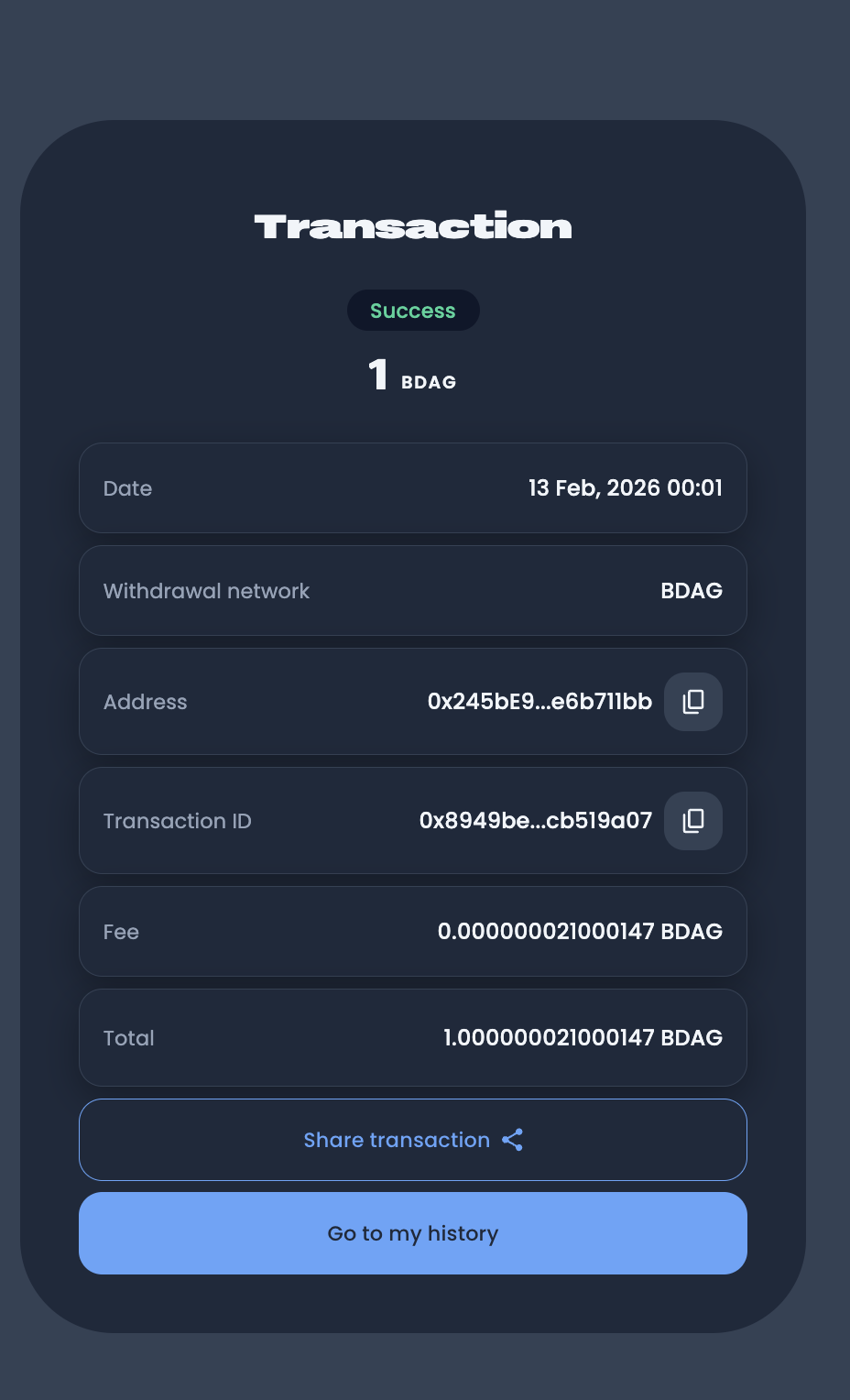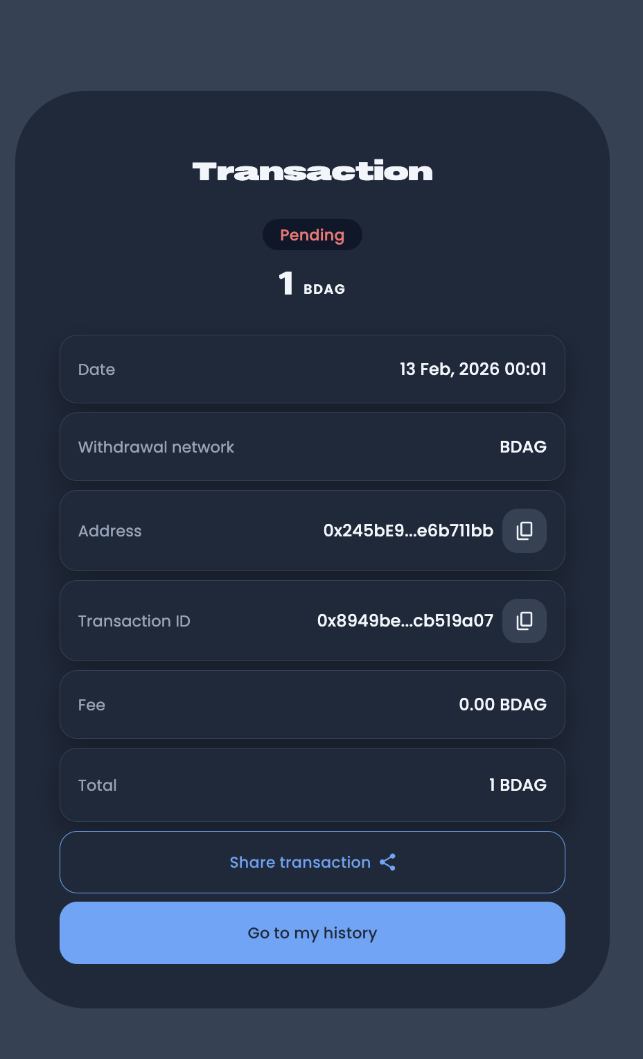 Sending BDAG has never been smoother. Our intuitive flow guides you through every step, ensuring you send the right amount to the right person.