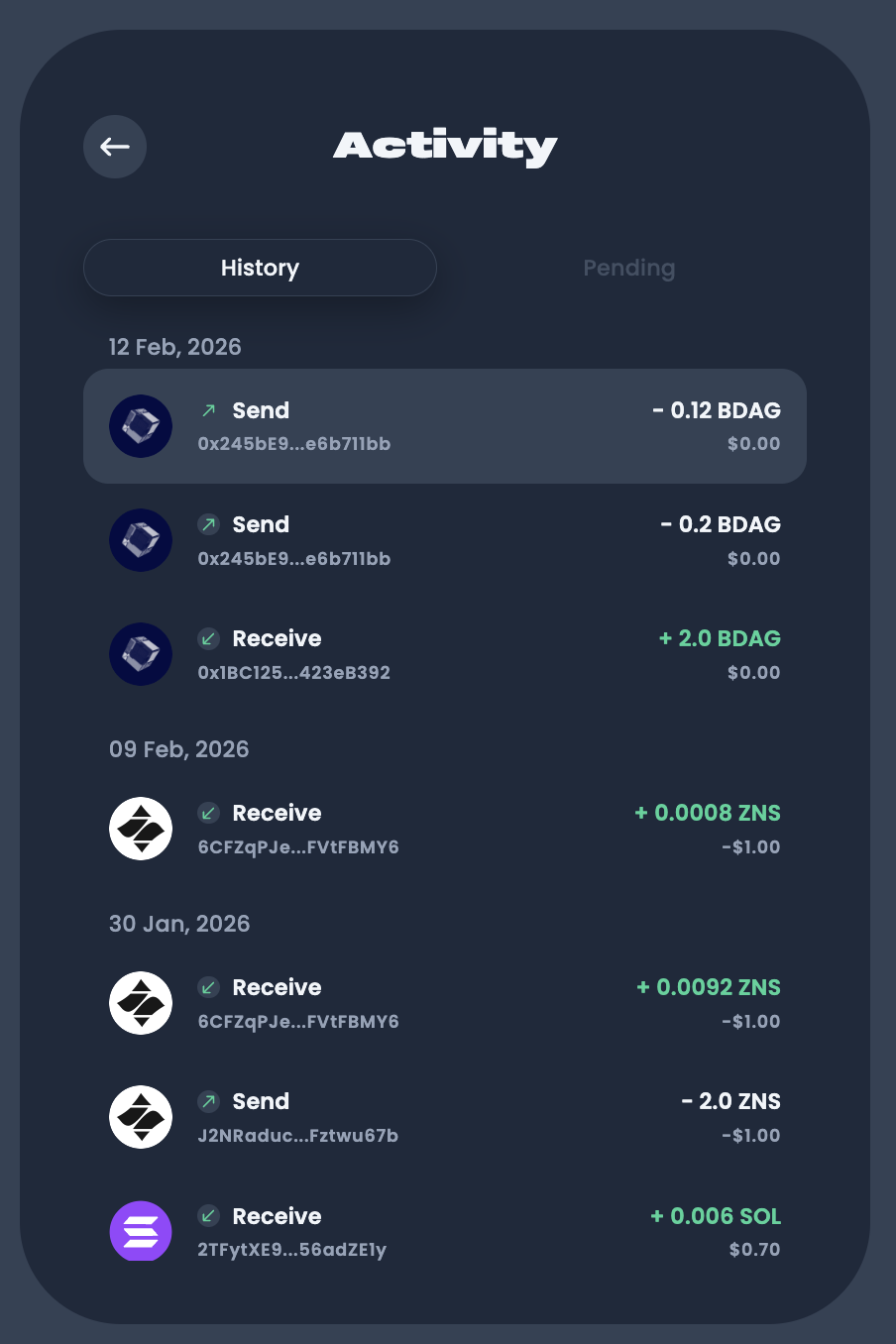 Keep track of all your incoming and outgoing transfers in one organized place. Your transaction history is enriched with ZNS names, making it easy to see who you've interacted with.