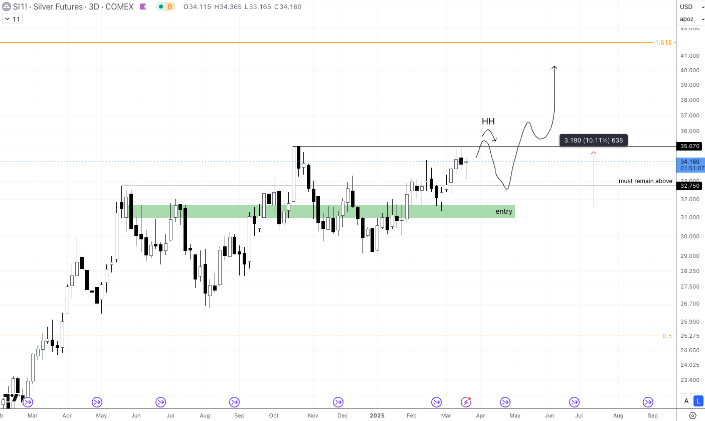 Our short-term silver long entry at $31 hit perfectly, and with price now reclaiming above $33+, we're sitting on a solid 8% gain – but for true confirmation of further upside, we need to see a decisive sweep of the previous $35.2 highs to validate the breakout and fuel the next leg higher. Ideally, I'd want to see the higher high print soon before any retrace. Here's how I see this playing out...
