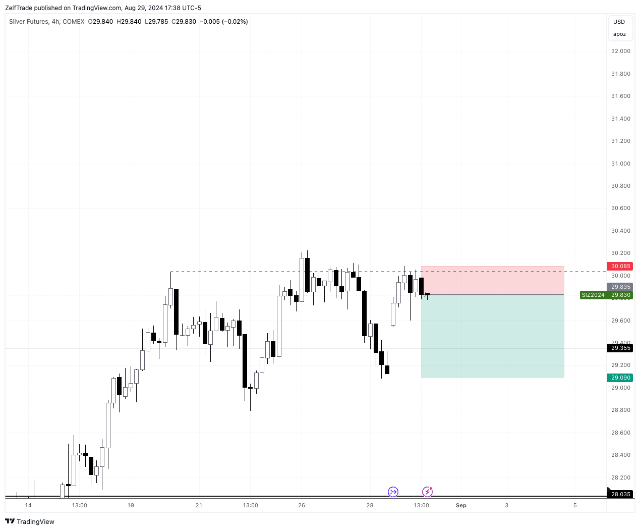 Short term there is a similar setup to gold. Short at market price, stop at previous highs and we will target the lows at $29.