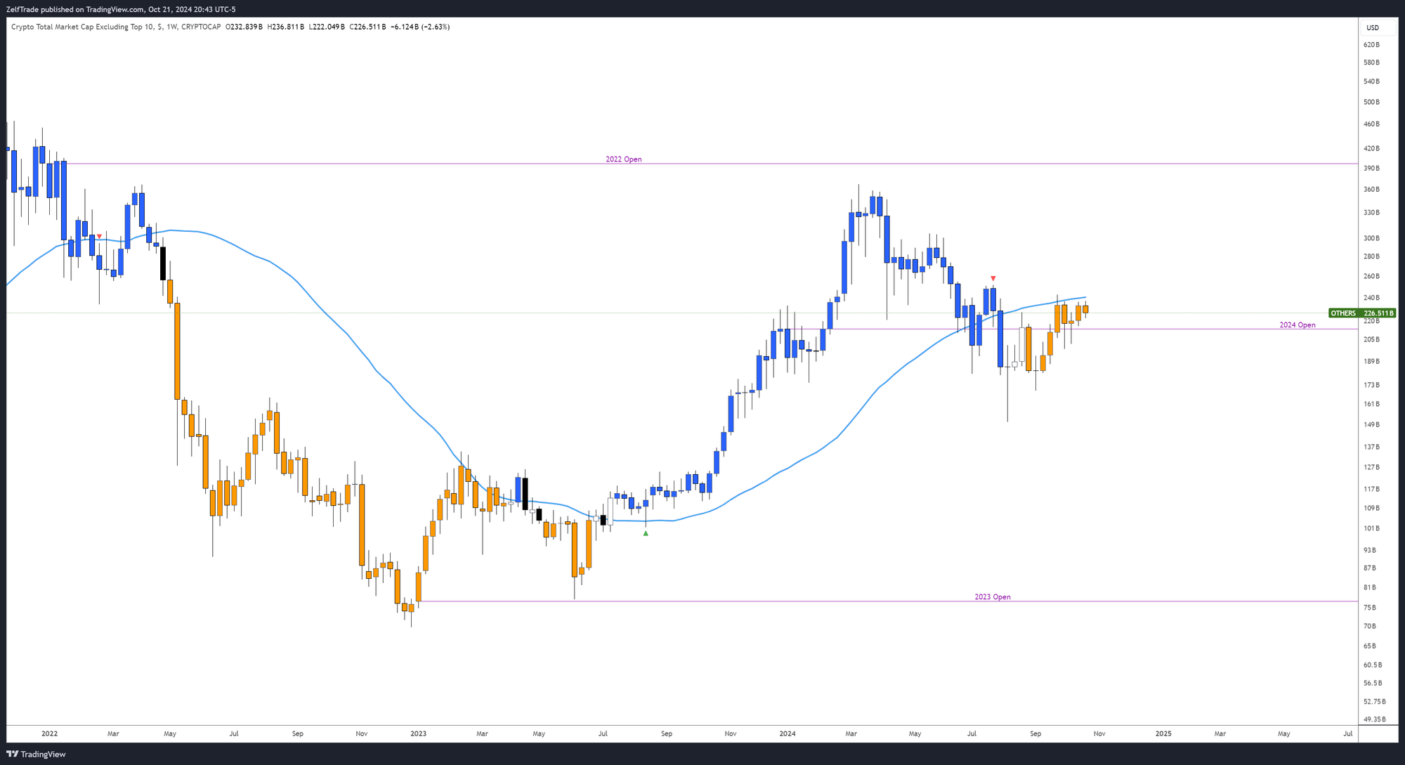 The chart below (Altcoin Index) shows a reclaim of the 2024 Open, creating a technical setup after the price deviation below this level. If it moves above the Blue MA and starts printing blue candles, it will signify a trending environment, indicating that the market is returning to full risk-on mode. Conversely, if it drops below the 2024 Open, we’ll need to reevaluate the bullish narrative and recognize a clear invalidation of our current outlook.
