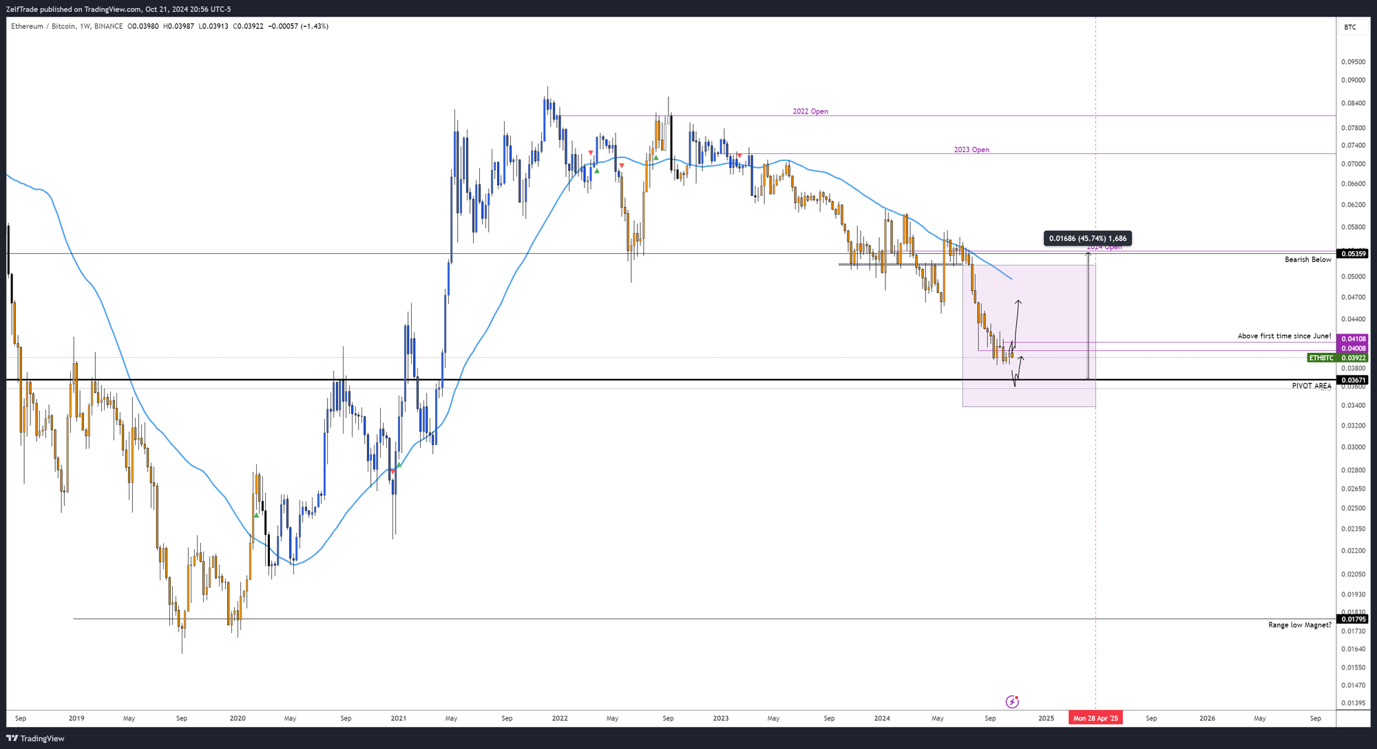 The silver lining is its retest of a macro pivot at 0.036, which presents a solid opportunity to position for a potential move in Ethereum. Beyond that, the momentum seems lackluster—here's hoping the bearish monthly signal reverses!