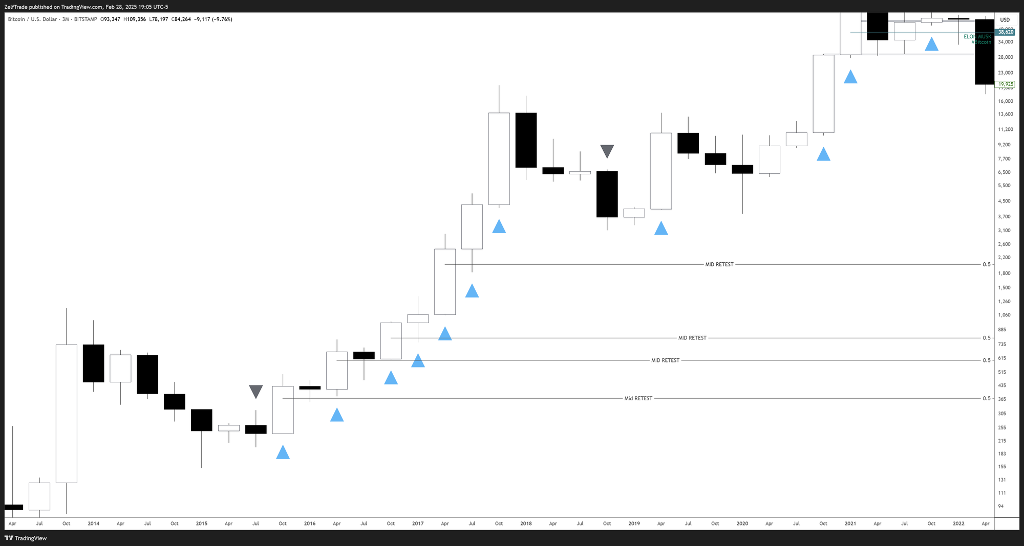 Below, you can take a look at the previous cycle and see how often the mid-levels were tested before continuing higher. Every single time, after a retest, new highs were made. Yes, the market was much smaller back then, but it still offers an interesting perspective on where we might be headed.