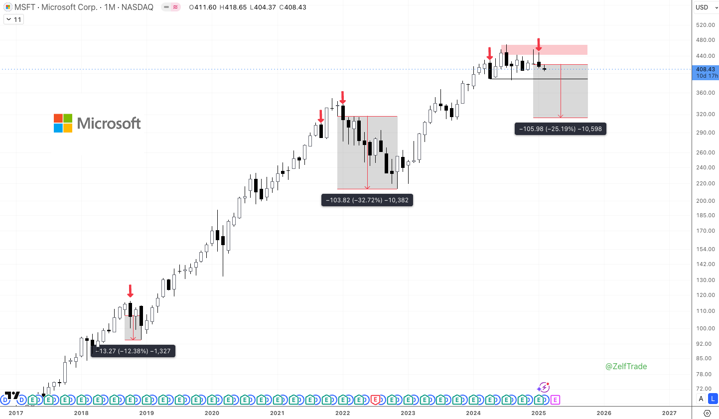 Since our last report, $MSFT stock’s price action has been relatively stagnant, failing to deliver any meaningful moves in either direction. While this may feel like a calm before the storm, the bearish engulfing candle on the monthly chart—a pattern that has historically preceded steep retraces continues to loom large.