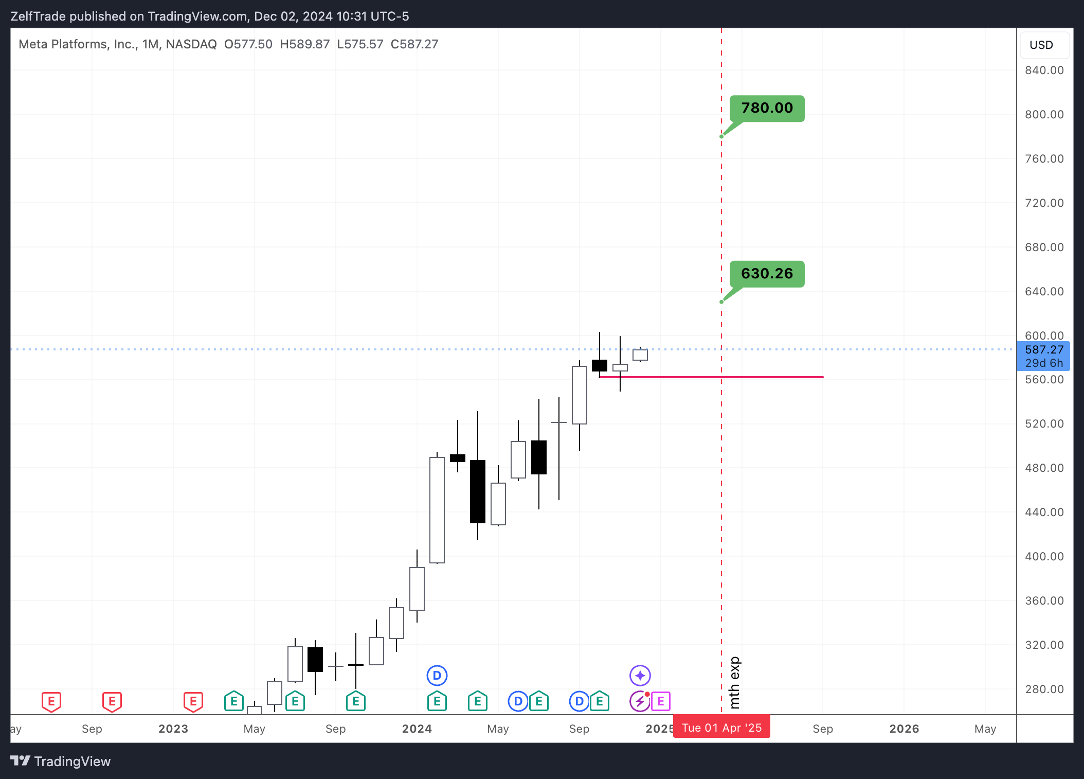 This on has a monthly time at mode bullish trend confirmed with targets of $630 and $780 set to expire on April 2025th.