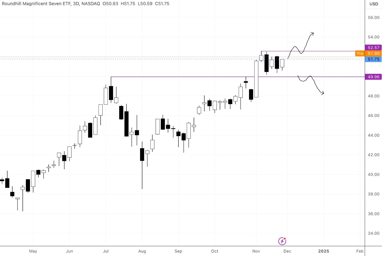 Short term safer bet will be to short weakness at the range highs of $52's and long at $50's nonetheless the best macro play will be to wait for a strong higher timeframe chart close above $52.6 for further upside or a close below $50 for a steeper retrace.