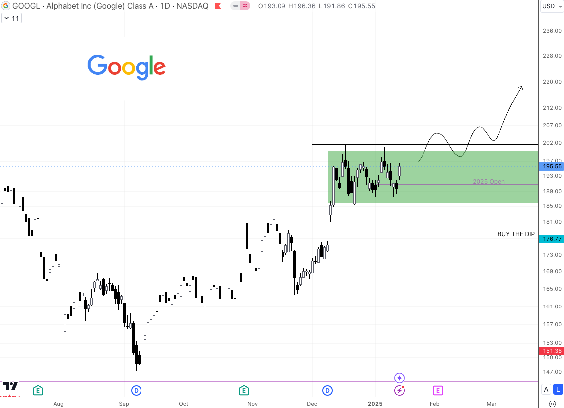 Alphabet $GOOGL outlook remains the same, macro extremely bullish but short term not so much... Unless price gets a strong close above previous all time high there's not much to be exited about. Any risk adverse investors trying to profit swing trade try getting in as close as possible to the yearly open of $190 and targeting $200.
