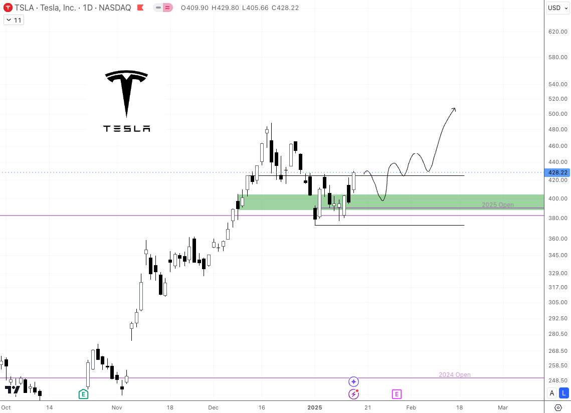 Despite December's weak monthly close, Tesla $TSLA keeps showing strength on lower timeframes. On the daily chart price just made a higher high and any retrace toward $400's should be a buy. As long as the lows of $370 holds, we should be in for further upside. And due to the fact Elon is working hand by hand with Trump... and the take office inauguration right around the corner, expect more upside.