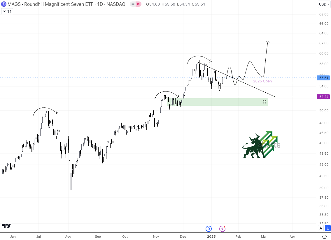 New Year’s Macro Outlook... Quite the run for the Roundhill Magnificent Seven ETF $MAGS as December kept making higher highs. Now for the first time in a while the 3 day chart just printed a bearish signal with possibility of a retrace toward $51’s. If we do get this retrace,