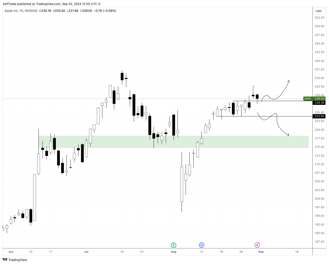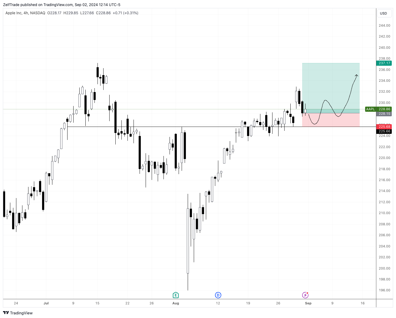 Awaiting the new Iphone 16 set to be released this month this stock is likely to continue its bullish run short term. As previously mentioned, price was at a key level and needed to break either side. It started to break bullish now. Price needs to stay above $228 for further bullish momentum to continue.