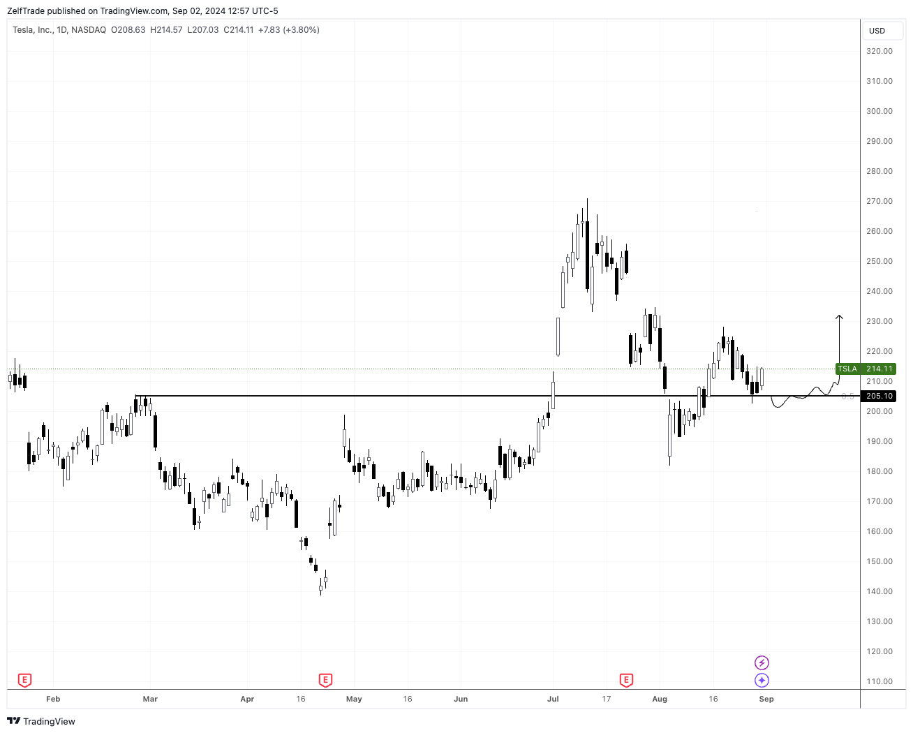 Price seems to have found a temporary bottom at $205’s. Any retrace toward this lows might be a good buying opportunity as long as we remain above.