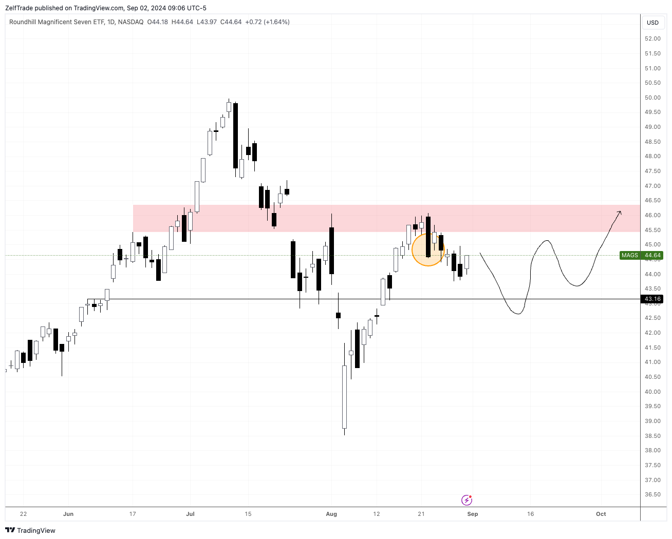 As mentioned in last Monday’s report, the MAGS etf was showing weakness and was more than likely in for a short term retrace. The retrace is now on its way. Ideally we want a continuation toward the $43 price area.