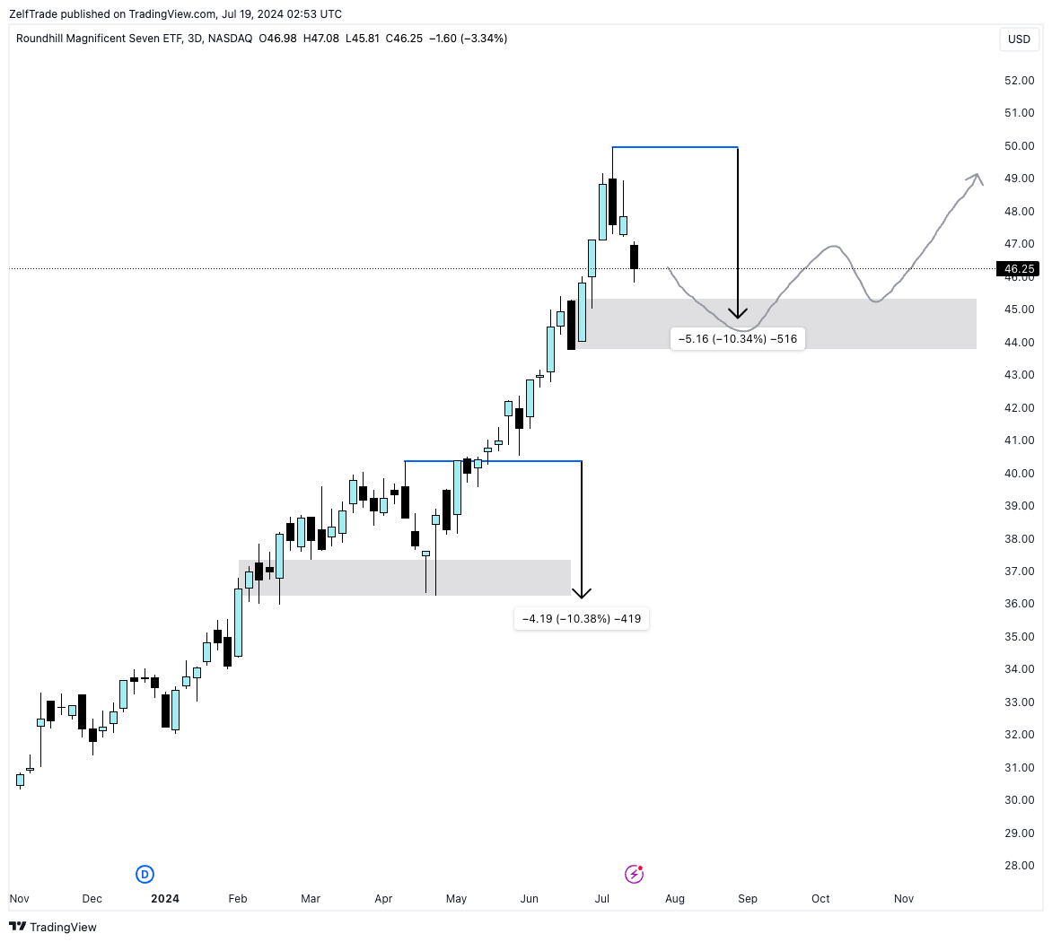 - We could have a correction to around $44 price range and on the long run we'll still be bullish. Most of the Mag 7 stocks look strong but a possible retrace across the board is still in play.