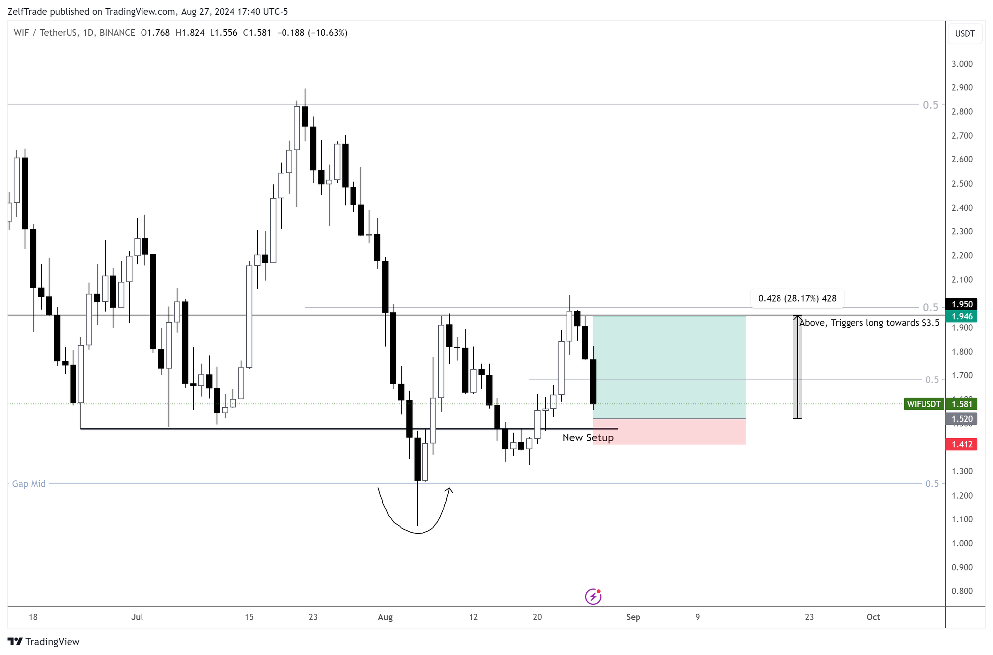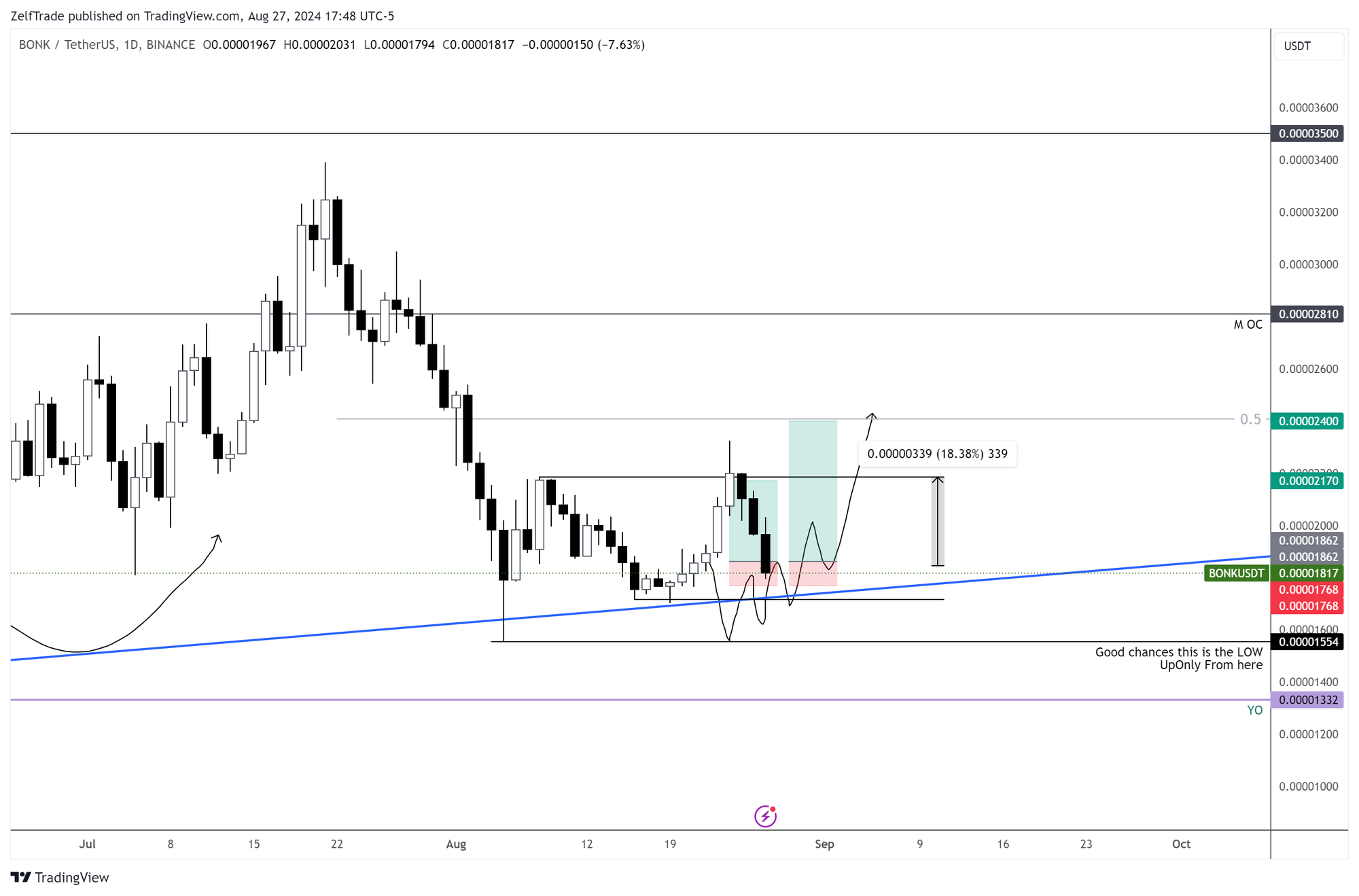 This trade was fluid and quick, resulting in a +18% gain. BONK formed a rounding bottom following the trend line, making it a buy-and-wait situation.